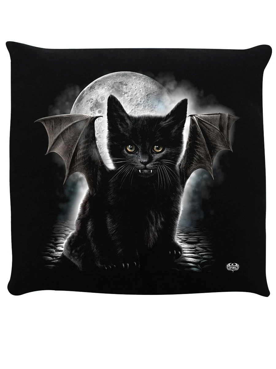 Tiny fangs at the ready! With a little purr, be careful this seemingly harmless kitty doesn’t let out more of a grisly roar and a snappy bite. Lit up by the full moon behind him, this black cat is like none you’ve ever seen before. Pointed bat wings and sharper teeth than any, don’t be surprised to see him using his nine lives flying upside down. Cute but deadly, just like you, this awesome cushion by Spiral will be the perfect centre piece for your bedspread if you can’t resist adorable and gothic decor.
