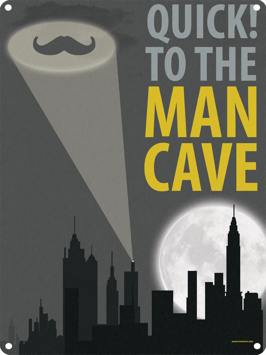Humour Tin Sign: ‘Quick! To The Man Cave’! Make your escape to your very own man cave with this spoof Batman tin sign! Set on a grey backdrop, it features a silhouette of Gotham City and a large light shining into the sky. The reflected moustache is a hilarious reminder that this definitely is a place for men only and any unwanted visitors will be banished immediately! Hang this on your door and let all your friends know that they are free to enter your man cave any time they like.