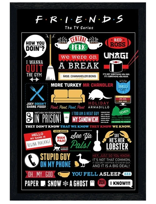 Television Maxi Poster: One of the most popular sitcoms to ever grace our screens, Friends has enjoyed immense success since it’s debut in 1994. If you followed the ups and downs over the 10 years that is was aired in the lives of Rachel, Monica, Phoebe, Joey, Chandler, and Ross, you are sure to appreciate this fantastic poster crammed full of phrases, quotes and quips featured in the show. From Ross’ ‘We were on a break’ to Joey’s ‘How you doin’, keep the joys of Friends alive and hang this brightly coloured poster on your wall.