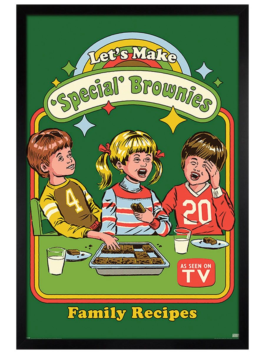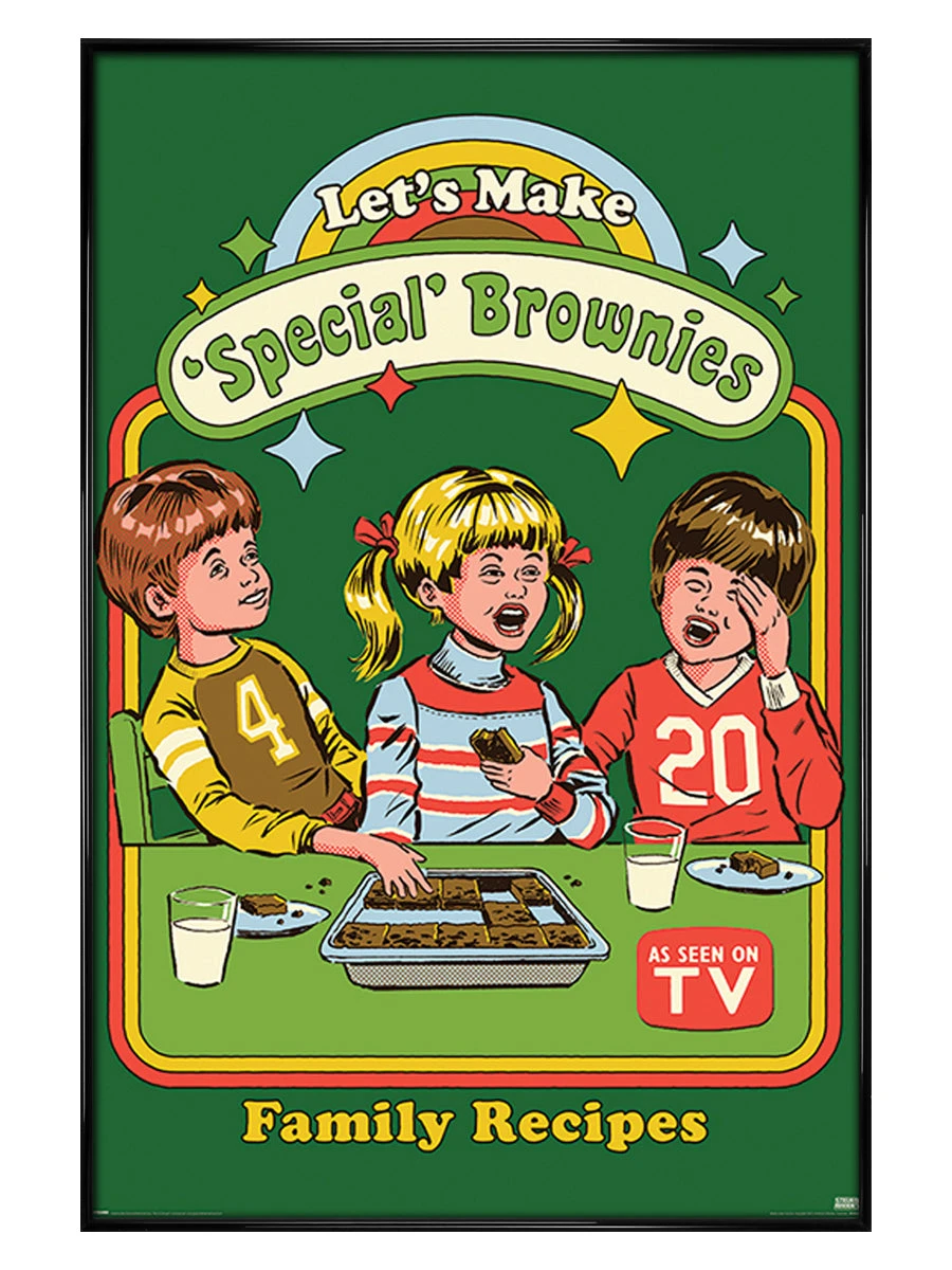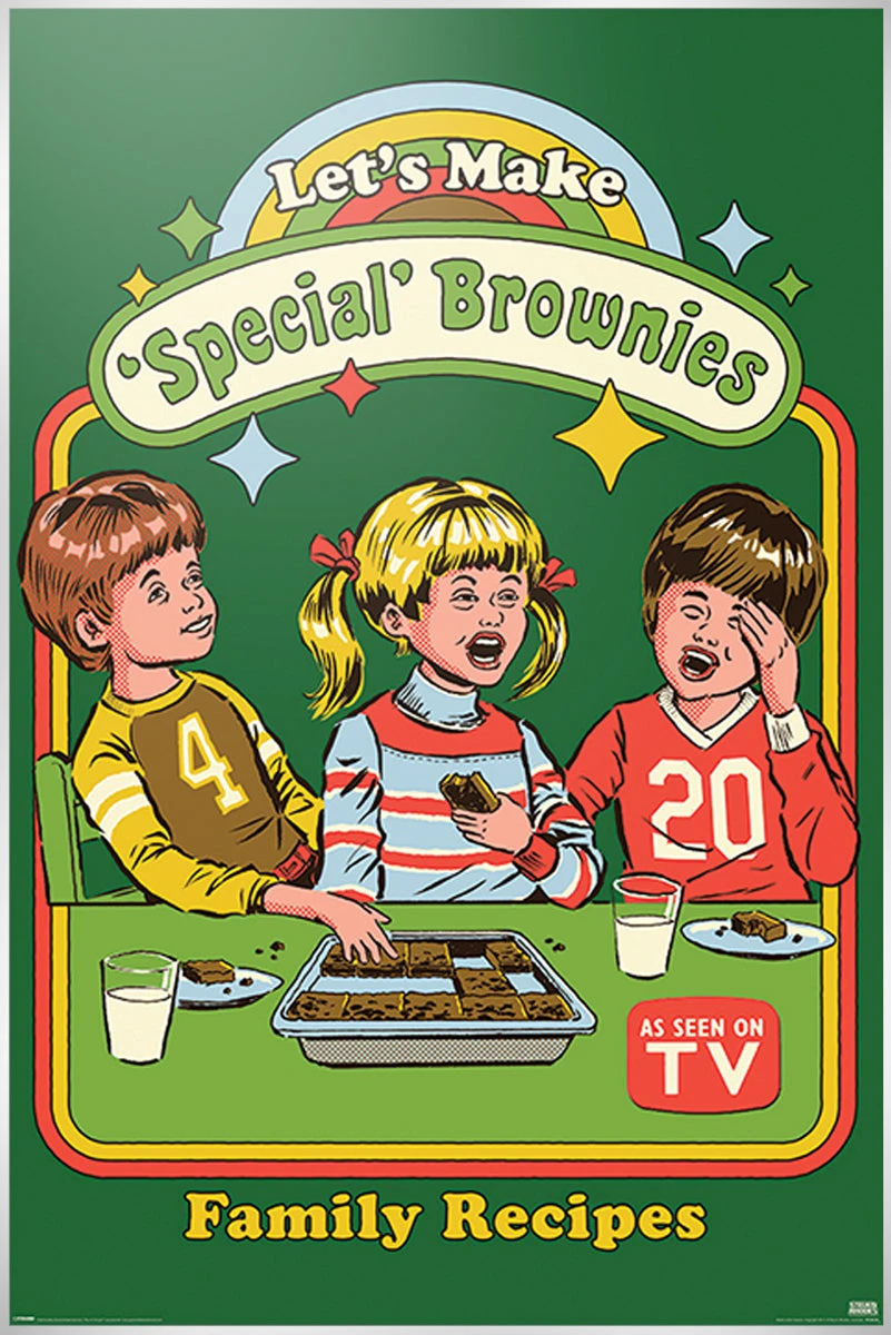 It doesn’t take a culinary chef to find out what’s hiding inside these ‘Special Brownies’. From the amazing mind of retro artist Steven Rhodes, this comical poster depicts 3 young children gorging on delicious, freshly make brownies straight from the family recipe book. Stylised in the form of an 80’s children’s book, this funny poster is a great addition to your wall space if you have a seriously comical side.