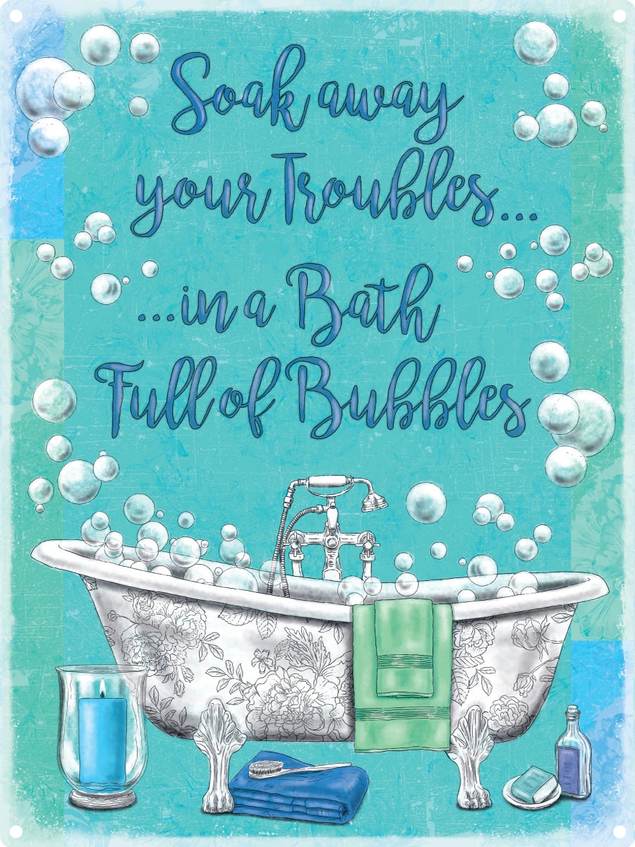 Lovely jubbly! There is nothing quite like a long, hot soak in the bath at the end of a busy day. This tin sign features an inviting bath tub filled with bubbles pictured on a blue background, along with the oh-so-true caption ‘Soak Away Your Troubles In A Bath Full Of Bubbles’ printed in blue, swirly font. Hang this in your home and remind your household of this message every day. Just don’t blame us for the water bill!