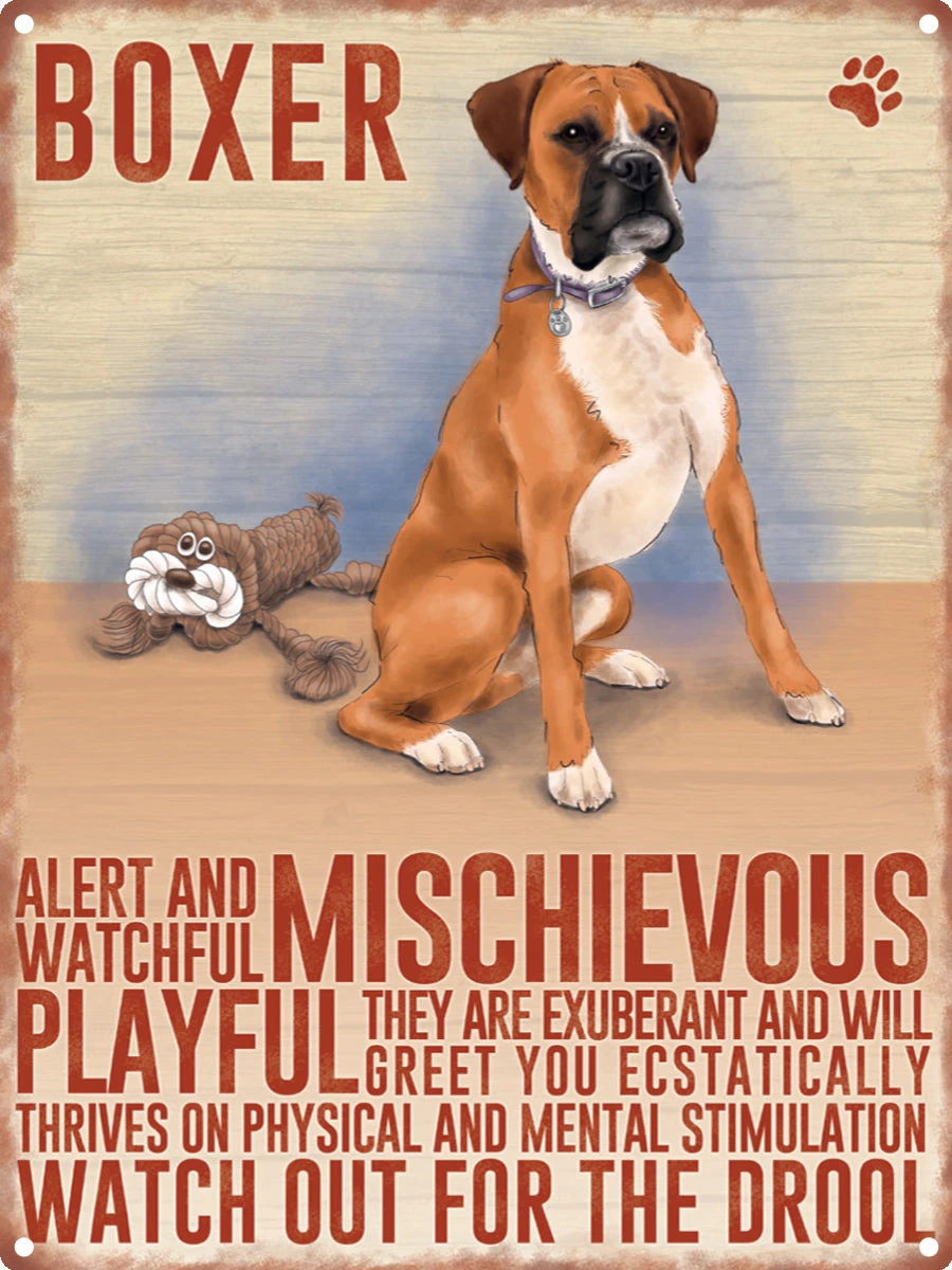 Do you have an excitable Boxer dog at home? If so, then display their loveable traits for all to see. This sign features a white and tan Boxer dog sitting up with his rope toy behind him and the caption ‘Boxer. Alert And Watchful, Mischievous, Playful, They Are Exuberant And Will Greet You Ecstatically, Thrives On Physical And Mental Stimulation, Watch Out For The Drool’ printed in red font. Hang this sign in your home and give your visitors a heads up about the slobber!